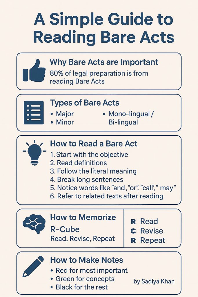 Most of your legal preparation (almost 80%) comes from reading Bare Acts. Books, notes, and commentaries are useful, but they cannot replace the original law. If you want to build a strong foundation in law, start with Bare Acts.